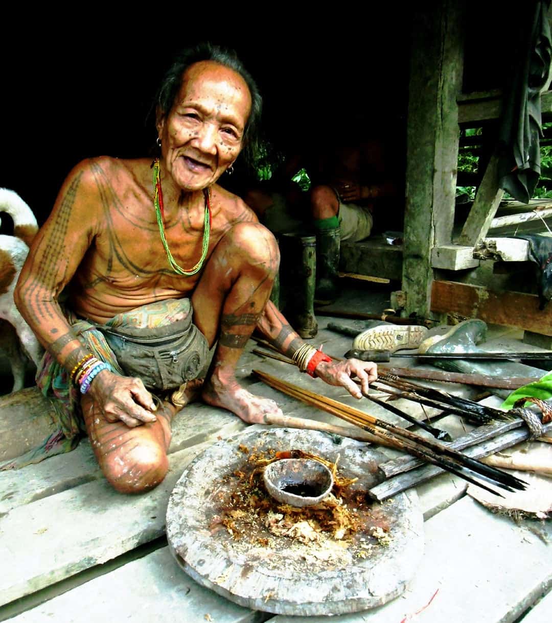 So…not just any member of the tribe can do this. To make tattoos they hold a special ceremony and each drawing has special meaning. One particular tattoo that only the Sikerei is allowed to have is Sibalu Balu, the sun-shaped tattoo which means “star of life”. This shows how important the role of Sikerei in their tradition.